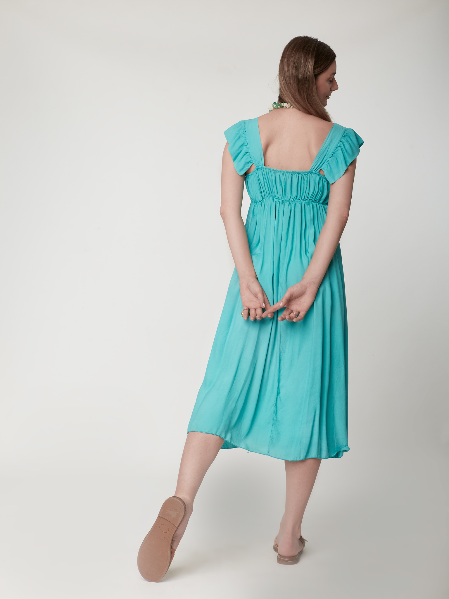 Φόρεμα Midi Βισκοζ Μονόχρωμο One Size με Βολάν στα Μανίκια & Λάστιχο στην Πλάτη